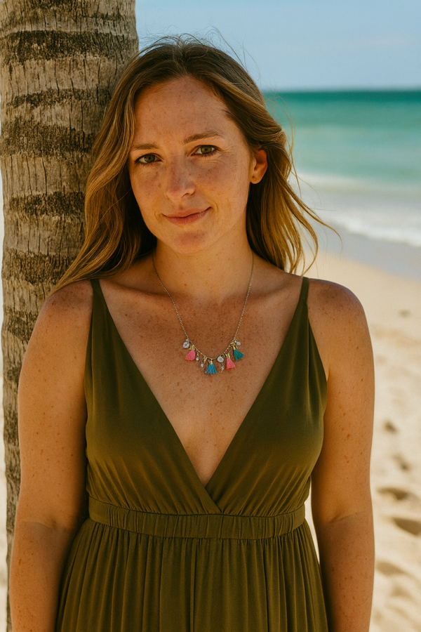 A playful fusion of color and charm — this handcrafted necklace features vibrant pink, blue, and turquoise tassels paired with silver leaf and floral charms. Designed to capture carefree summer vibes, it’s the perfect statement piece for beach days and boho adventures.